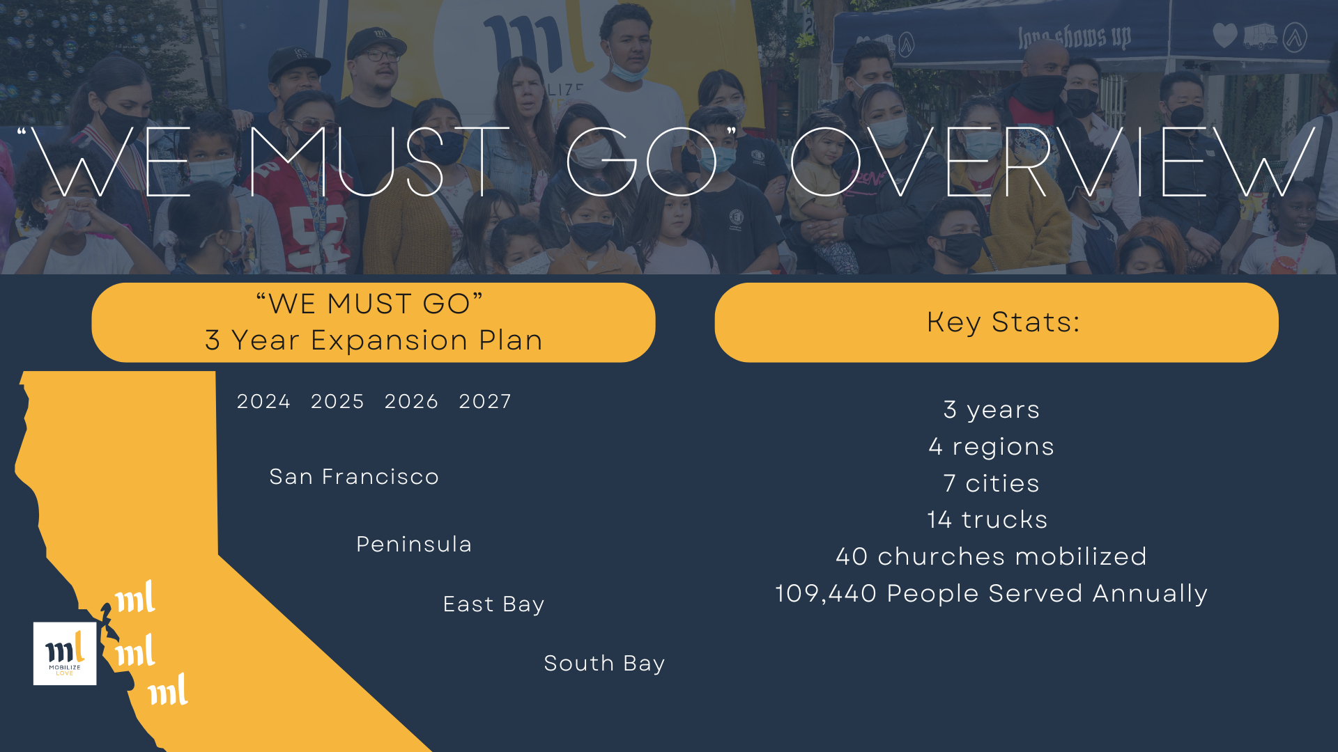 The “We Must Go” Campaign is a three-year expansion plan that will scale Mobilize Love from one region to four regions, increase our fleet from 8 trucks to 14 trucks, and expand our reach from serving 52,000 to over 109,000 children and their families annually, mobilizing over 40 churches across seven cities in the Bay Area.
